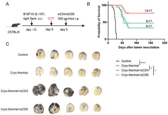 Activated CD4+ and CD8+ T cells at the early stage after CTT mediated long-term survival and prevented lung metastasis. (A) Scheme of the experiment design. A total of 300 μg of anti-CD4 or anti-CD8α antibodies were injected intraperitoneally on day 5 after CTT in the B16F10 model (n = 17). (B) Kaplan–Meier survival curve of the tumor-bearing control, CTT, CTT with CD4+ T cell depletion, and CTT with CD8+ T cell depletion groups. (C) The lung metastasis of each group (n = 5). * p < 0.05, **** p < 0.0001. In Kaplan–Meier plots, p values are determined via log-rank (Mantel–Cox) tests.