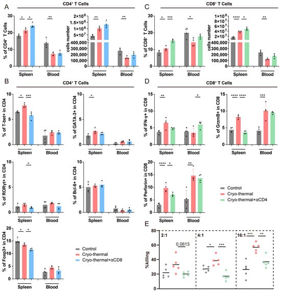 Crosstalk occurred between activated CD4+ and CD8+ T cells. (A) Proportion and absolute number of CD4+ T cells in the spleen and blood. (B) Subsets of CD4+ T cells in the spleen and blood. (C) Proportion and absolute number of CD8+ T cells in the spleen and blood. (D) IFN-γ, granzyme B, and perforin expression in CD8+ T cells in the spleen and blood. (E) Killing assay of splenic CD8+ T cells. All of the data are presented as the means ± SD. n = 4 for flow cytometry and n = 5 for killing assay. * p < 0.05, ** p < 0.01, *** p < 0.001, **** p < 0.0001. Data for graphs were calculated by one-way ANOVA.