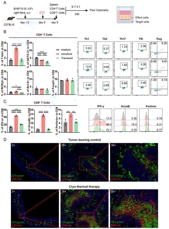 CTT-activated CD4+ and CD8+ T cells interacted via cell–cell contact. (A) Scheme of research design. CD4+ and CD8+ T cells were separately isolated by MACS on day 5 after CTT, and then cocultured at an effector-to-target ratio of 2:1 for 24 h. (B) Subsets of CD4+ T cells. (C) IFN-γ, granzyme B, and perforin expression in CD8+ T cells. (D) Immunofluorescence staining images of splenic CD4+ and CD8+ T cells of mice from the tumor-bearing or CTT group on day 7. All of the data are presented as the means ± SD. n = 4 for each group. * p < 0.05, ** p < 0.01, *** p < 0.001, **** p < 0.0001. Data for graphs were calculated by one-way ANOVA.