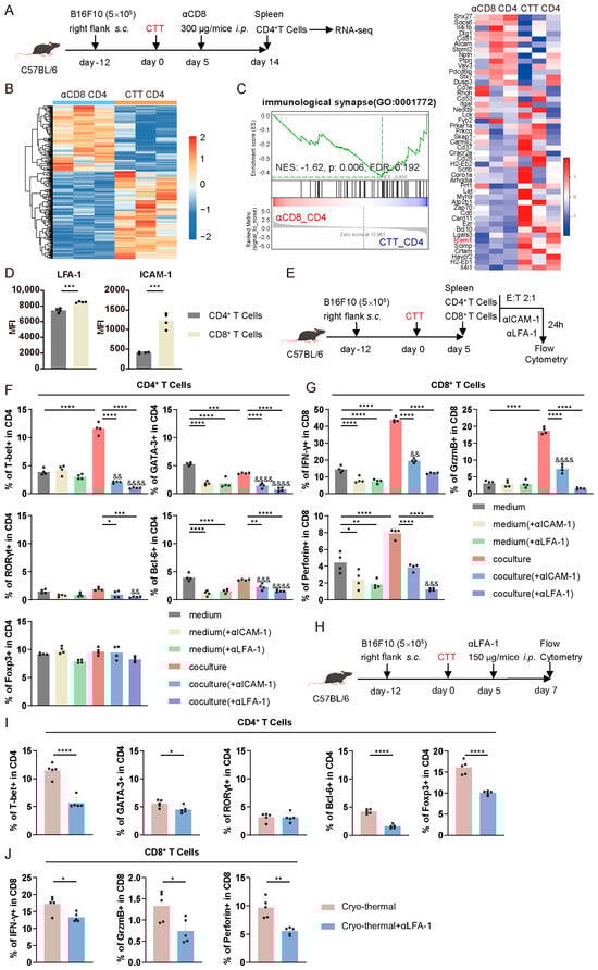 CTT-activated CD4+ and CD8+ T cells crosstalk depended on the LFA-1/ICAM-1 interaction. (A) Scheme of research design. A total of 300 μg of anti-CD8a antibodies were injected intraperitoneally on day 5 after CTT. All mice were sacrificed on day 14 to isolate splenic CD4+ T cells for RNA-seq. (B) Heatmap of differentially expressed genes in CD4+ T cells from the CTT group and the CD8+ T cell depletion group. (C) Gene enrichment of immunological synapse pathway according to GSEA in CD4+ T cells. (D) The expression of LFA-1 and ICAM-1 on CD4+ and CD8+ T cells. (E) Scheme of research design. CD4+ and CD8+ T cells were isolated by MACS on day 5 after CTT, and then cocultured at an effector-to-target ratio of 2:1 with the anti-ICAM-1 or LFA-1 antibodies for 24 h. (F) Subsets of CD4+ T cells. (G) IFN-γ, granzyme B, and perforin expression in CD8+ T cells. (H) Scheme of research design. A total of 150 μg of anti-LFA-1 antibodies were injected intraperitoneally on day 5 after CTT. All mice were sacrificed on day 7 to detect the phenotype of splenic CD4+ and CD8+ T cells. (I) Subsets of CD4+ T cells in the spleen. (J) IFN-γ, granzyme B, and perforin expression in CD8+ T cells in the spleen. All of the data are presented as the means ± SD. n = 3 for RNA-seq, n = 4 for in vitro experiment, n = 5 for in vivo experiment. * p < 0.05, ** p < 0.01, *** p < 0.001, **** p < 0.0001. Compared to the medium group, && p < 0.01, &&& p < 0.001, &&&& p < 0.0001. Data for graphs (D) and (I,J) were calculated by Student’s t-test, and data for other graphs were calculated by one-way ANOVA.