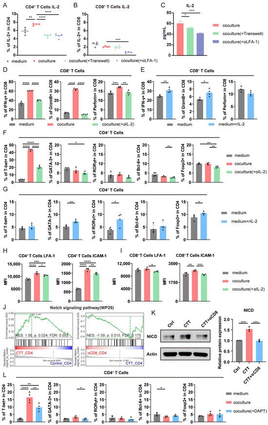 LFA-1/ICAM-1 interactions between CD4+ and CD8+ T cells promoted the expression of cytotoxic molecules in CD8+ T cells via IL-2-STAT5 signaling and the differentiation of CD4+ T cells into Th1 via Notch1 signaling. (A,B) The expression of IL-2 in (A) CD4+ and (B) CD8+ T cells. (C) The concentration of IL-2 in cultivation of supernatant. (D,E) IFN-γ, granzyme B, and perforin expression in CD8+ T cells (D) after IL-2 blockade or (E) rIL-2 supplementation. (F,G) Subsets of CD4+ T cells (F) after IL-2 blockade or (G) rIL-2 supplementation. (H,I) The mean fluorescence intensity of LFA-1 and ICAM-1 on (H) CD4+ and (I) CD8+ T cells. (J) The enrichment analysis of Notch signaling in CD4+ T cells. (K) The expression of NICD in CD4+ T cells. (L) Subsets of CD4+ T cells after blocking Notch1 signaling. All of the data are presented as the means ± SD. n = 4 for flow cytometry, n = 3 for RNA-seq or Western blot. * p < 0.05, ** p < 0.01, *** p < 0.001, **** p < 0.0001. Data for graphs (E) and (G) were calculated by Student’s t-test; data for other graphs were calculated by one-way ANOVA.