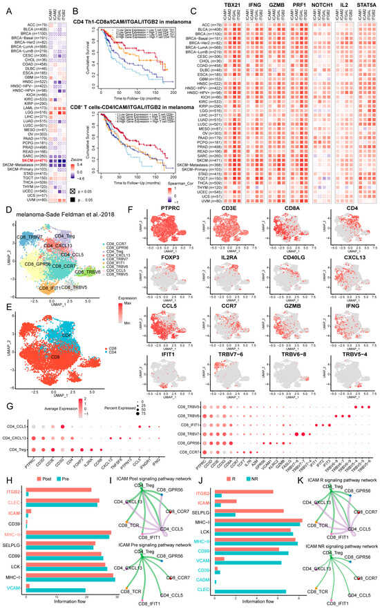 Clinical outcomes associated with LFA-1/ICAM-dependent interaction between CD4+ and CD8+ T cells. (A) Heatmap showing the associations between clinical outcomes and the expression of ICAM, ITGAL, and ITGB2 across multiple cancer types from TIMER 2.0 database. (B) The Kaplan–Meier survival curve of the expression of ICAM, ITGAL, ITGB2, and T cell infiltration in predicting melanoma survival from TIMER 2.0 database. (C) Heatmap showing the associations between ICAM, ITGAL, and ITGB2 with T cell activation markers and the involved in mechanism markers. (D) UMAP of the 9 clusters of the T cell. (E) CD4+ T cells and CD8+ T cells were identified by marker genes. (F) Feature plot of the different marker gene expressions across CD4+ and CD8+ T cells. (G) Dot plot of the different marker genes of CD4+ T cells (left) and CD8+ T cells (right). (H) The communication probability of pathways and (I) the ICAM signaling pathway net between CD4+ and CD8+ T cells from pre-treatment to post-treatment, analyzed by CellChat. (J) The communication probability of pathways and (K) the ICAM signaling pathway net between CD4+ and CD8+ T cells from nonresponders to responders, analyzed by CellChat [17].