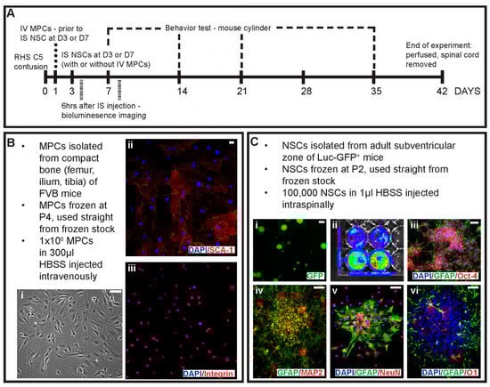 Schematic of experimental design and primary cell cultures used in the study. (A) Outline of the experimental design, timing of injections and key timepoints in the study. Cells were obtained from primary cell cultures including (B) MPCs isolated from the compact bone of FVB mice with (i) phase image of MPCs in culture. Isolated MPCs were positive for (ii) Sca-1 and (iii) integrin. (C) Primary cell cultures of NSCs were isolated from the adult subventricular zone of Luc-GFP+ mice with (i) showing endogenous expression of GFP, (ii) bioluminescence signal, spontaneous differentiation of adhesive NSCs with (iii) GFAP and Oct-4 and (iv) GFAP and MAP-2. NSCs when co-cultured in a non-contact mediated manner with MPCs differentiated into cells expressing (v) NeuN and GFAP and (vi) GFAP and O1 for neurons, astrocytes and oligodendrocyte identification. Scale bars = 20 μm.