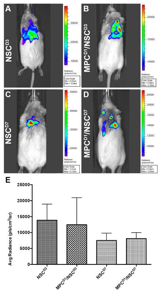 Luc-GFP+ NSCs were injected intraspinally at D3 or D7 post-injury with or without IV injection of MPCs at D1 post-injury; cell fate was tracked using bioluminescence imaging. Six hours after injection, NSCs were tracked. A signal indicating the presence of NSCs was observed in all animals that had received an intraspinal injection of NSCs (Figure 2A–D) with varying flux (Figure 2E). The detectable amount of signal was low at 6 h, most likely due to factors such as the number of cells injected (100,000 cells), depth of penetration, and presence of multiple tissue layers (fur, skin, fat tissue, and muscle). Twenty-four hours after injection, a minimal signal was detected, and by day seven, post-injection, no signal was detected in any of the mice. The total flux detected by bioluminescence did not correlate with the number of surviving NSCs subsequently observed in the sectioned spinal cord.