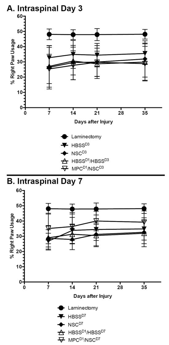 Mean right paw usage over 5 weeks after NSC transplantation in cervical spinal cord injury. Mouse cylinder test results for (A) mice with contusion injury receiving NSCs at D3 and (B) mice with contusion injury receiving NSCs at D7. No statistically significant difference was observed at any timepoint, irrespective of whether an intravenous injection of MPCs was administered beforehand. Error bars show the standard deviation.