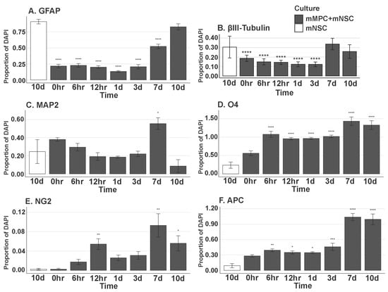 In vitro differentiation of NSC in MPC Secretome. Proportion of (A) GFAP+ (0 h, p = 5.107 × 10−15; 6 h, p = 5.107 × 10−15; 12 h, p = 5.107 × 10−15; 1 d, p = 5.107 × 10−15; 3 d, p = 5.107 × 10−15; 7 d, p = 9.681 × 10−14), (B) βIII-Tubulin (Tuj1)+ (0 h, p = 1.571 × 10−5; 6 h, p = 4.319 × 10−6; 12 h, p = 3.994 × 10−6; 1 d, p = 3.317 × 10−7; 3 d, p = 5.540 × 10−7), (C) MAP2+ (7 d, p = 1.295 × 10−2), (D) O4+ (6 h, p = 5.816 × 10−10; 12 h, p = 3.555 × 10−8; 1 d, p = 2.663 × 10−8; 3 d, p = 3.029 × 10−9; 7 d, p = 9.575 × 10−12; 10 d, p = 1.379 × 10−11), (E) NG2+ (12 h, p = 5.697 × 10−3; 1 d, p = 2.377 × 10−1; 7 d, p = 1.800 × 10−3; 10 d, p = 1.965 × 10−2), and (F) APC+ (6 h, p = 2.595 × 10−3; 12 h, p = 3.132 × 10−2; 1 d, p = 1.087 × 10−2; 3 d, p = 3.945 × 10−4; 7 d, p = 0.0000; 10 d, p = 0.0000) DAPI+ Nuclei. All groups listed are in mMPC + mNSC cultures, and the statistics are computed in comparison to the 10-day mNSC-only group. Error bar shows standard error of the mean. * (p < 0.05), ** (p < 0.01), *** (p < 0.001), **** (p < 0.0001).