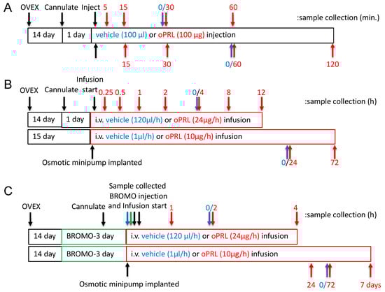 Figure 1B,C). The osmotic minipumps filled with oPRL (10 mg/mL) were connected to the jugular cannula and secured subcutaneously (s.c.) on the ventral chest. oPRL was delivered with a flow rate of 1 µL/h for up to 3 days (Model 1003D) or for 7 days (Model 2001). Where indicated, some rats were injected subcutaneously (s.c.) with bromocriptine mesylate (3 mg/kg; Tocris Biosciences, Minneapolis, MN USA) or 20% ethanol vehicle (0.5 mL/kg rat weight, s.c.) at 12 h intervals (