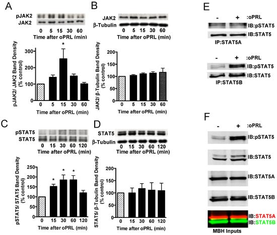 20]. As with other PRL-responsive tissues, this study confirms that the JAK2-STAT5 signaling pathway was rapidly activated and that STAT5B was the isoform activated by PRLR signaling in cells within the MBH of rats. These data are consistent with previous studies using rats or
