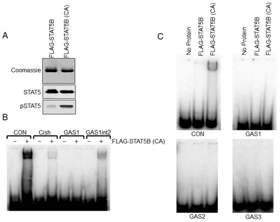 CAD cells on 100 mM plates were transfected with 10 µg of FLAG-STAT5B or FLAG-STAT5B-N642H plasmid DNA for 18 h. Twenty-four hours after transfection, cells were lysed in a buffer containing 150 mM sodium chloride, 50 mM Tris (pH = 7.5), 1.0% Triton X-100, 1.0 mM ethylenediaminetetraacetic acid (EDTA), 1 mM sodium fluoride, 0.2 mM sodium orthovanadate, aprotinin (10 µg/mL), leupeptin (10 µg/mL) and pepstatin A (10 µg/mL). Lysates were applied to M2 FLAG agarose beads (Sigma Aldrich, St. Louis, MO, USA) and incubated overnight at 4 °C. Beads were then washed 5 times with lysis buffer and once with Tris-buffered saline (TBS, pH = 7.5). Proteins were eluted in TBS with 200 ng/mL FLAG peptide. Some of the purified proteins were then separated on SDS-PAGE and either stained with Coomassie Blue or subjected to western blot analysis using anti-STAT5 and anti-pSTAT5 antibodies. Radiolabeled double-stranded DNA (dsDNA) probes were generated by PCR using 32P adenosine triphosphate (ATP). Primer sequences used to generate the probes are shown below. Purified proteins were incubated in EMSA buffer (50 mM potassium chloride, 10 mM Tris pH = 7.5, 1 mM EDTA, 5.0% glycerol, 0.05% IGEPAL 630, and 1 mM dithiothreitol (DTT) with radiolabeled dsDNA probes for 20 min at room temperature, and reactions were then electrophoresed on 5% nondenaturing acrylamide gels and visualized on a Storm Phosphoimager.