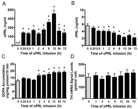 Th gene expression was elevated by 7 days of continuous administration of oPRL and rPRL using an osmotic minipump, resulting in PRL levels of approximately 100 ng/mL. Taken together, these data suggest that the timing, magnitude and mode of elevating PRL levels play a role in the PRL-induced elevation of