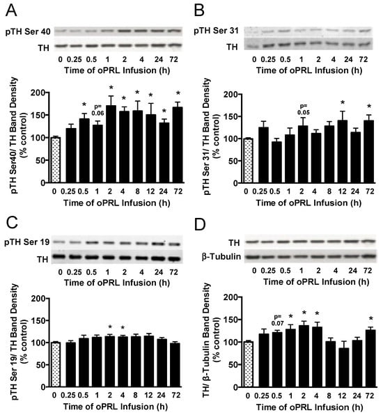 26]. Ser31 is a target of ERK 1/2, and its phosphorylation state was sporadically elevated during oPRL treatment in the current study. These data suggest that ERK 1/2 activation and TH Ser31 phosphorylation are unlikely to be the driving mechanism for increased TH activity, but may contribute to TH activation. Ma et al. [