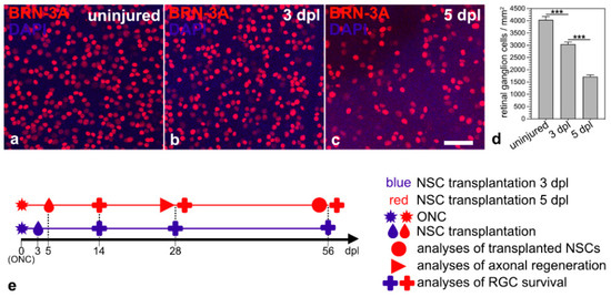 Time course of RGC loss induced by an intraorbital optic nerve crush. Qualitative (a–c) and quantitative (d) analyses of retinal flatmounts 3 (b,d) and 5 days (c,d) after ONC revealed a moderate and pronounced loss of BRN-3A-positive RGCs, respectively, when compared to retinas with uninjured optic nerves (a,d). Each bar in d represents the mean value (±SEM) of six animals. ***, p < 0.001 according to a one-way ANOVA followed by a Bonferroni post-hoc test. Schematic representation of the experimental design ((e); see Results for details). BRN-3A, brain-specific homeobox/POU domain protein 3A; dpl, days post-lesion; NSC, neural stem cell; ONC, optic nerve crush; RGC, retinal ganglion cell. Scale bar in (c) for (a–c): 50 µm.