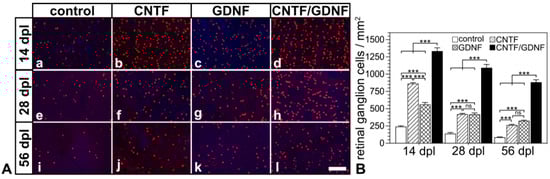 (A) Representative micrographs of retinal flatmounts from animals that had received NSC transplantations 3 days after ONC. The density of BRN-3A-positive RGCs in CNTF-treated (Ab,Af,Aj) and GDNF-treated (Ac,Ag,Ak) retinas was significantly higher than in control retinas (Aa,Ae,Ai) 14, 28 and 56 dpl. Note the significantly higher number of surviving RGCs at all post-lesion time points in retinas co-treated with CNTF and GDNF (Ad,Ah,Al). (B) Quantitative analysis of RGC survival. Each bar represents the mean value (±SEM) of six animals. ns: not significant; ***: p < 0.001 according to a two-way ANOVA followed by a Bonferroni post-hoc test. BRN-3A, brain-specific homeobox/POU domain protein 3A; CNTF, ciliary neurotrophic factor; dpl, days post-lesion; GDNF, glial cell line-derived neurotrophic factor; NSC, neural stem cell; ONC, optic nerve crush; RGCs, retinal ganglion cells. Scale bar: 100 µm.
