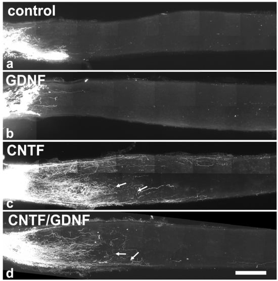 Axonal regeneration in animals that had received NSC transplantations 5 days after ONC. Analyses of animals with grafted control-NSCs (a) or GDNF-NSCs (b) 28 dpl revealed the presence of only a few regrown axons extending only a short distance beyond the lesion site. Animals with grafted CNTF-NSCs (c) or CNTF/GDNF-NSCs (d), in comparison, contained significantly more and longer regrown axons in the distal nerve stumps. Axons displayed an irregular course, and some made U-turns (arrows in (c,d)). CNTF, ciliary neurotrophic factor; dpl, days post-lesion; GDNF, glial cell line-derived neurotrophic factor; NSC, neural stem cell; ONC, optic nerve crush. Scale bar: 200 µm.