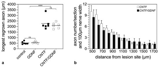 To compare the number of regenerating axons in CNTF- and CNTF/GDNF-treated animals, we counted the number of labeled axons every 100 µm, starting from 500 µm distal to the lesion site (Figure 6b). Statistical analyses of data revealed similar numbers of regrown axons in both experimental groups at all positions analyzed (Figure 6b). Thus, there was no significant difference in the length of the longest regenerated axons or the number of regenerated axons between CNTF- and CNTF/GDNF-treated animals.