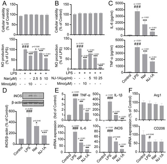 First, we investigated the inhibitory effects of NJ-1A and Nar on LPS-induced inflammatory factors in microglia. The results demonstrated that minocycline, used as a positive control, significantly inhibited the production of pro-inflammatory factors (nitric oxide (NO), interleukin-6 (IL-6), and tumor necrosis factor-α (TNF-α)) induced by LPS. Both Nar and NJ-1A potently inhibited the production of the aforementioned cytokines without affecting cell viability (Figure 2A–C). We also detected the expression of inducible nitric oxide synthase (iNOS), which is the key enzyme catalyzing NO production. The results showed that, after treatment with NJ-1A and Nar separately, the expression of iNOS decreased significantly compared to the LPS group (Figure 2D). Treatments with NJ-1A and Nar could also markedly reduce the mRNA expressions of these pro-inflammatory factors (Figure 2D). However, treatments with NJ-1A and Nar had no impact on the mRNA expressions of M2 anti-inflammatory factors Arginase 1 (Arg1) and CD206 (Figure 2F).