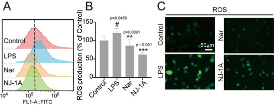 NJ-1A and Nar can inhibit the generation of ROS in BV-2 cells induced by LPS. (A,B) After BV-2 cells were stimulated with LPS for 24 h, the content of ROS inside the cells was detected by flow cytometry, n = 4. (C) Fluorescence microscopic images of BV-2 cells treated with LPS and/or NJ-1A and Nar after incubation with DCFH probe for 24 h. Data represent the mean ± SD; vs. Control, # p < 0.05; vs. LPS, ** p < 0.01, *** p < 0.001.