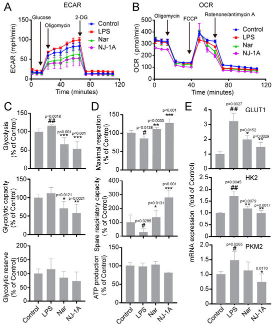 NJ-1A and Nar can reverse the glucose metabolic reprogramming of LPS-induced BV-2 cells. (A,C) NJ-1A and Nar can inhibit the increase of ECAR in BV-2 cells, n = 5, (B,D) and can reverse the decrease of OCR in BV-2 cells, n = 4. (E) NJ-1A and Nar inhibited the mRNA expression of key glycolytic enzymes, n = 4. Data represent the mean ± SD; vs. Control, # p < 0.05, ## p < 0.01; vs. LPS, * p < 0.05, ** p < 0.01, *** p < 0.001.