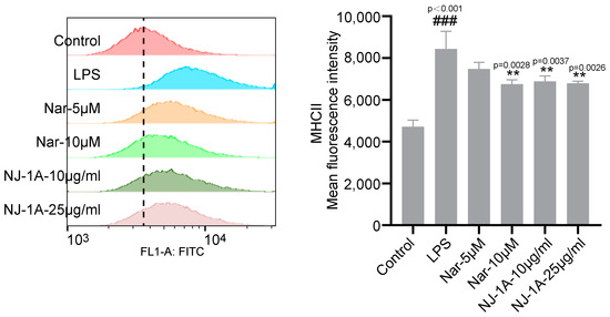 Major histocompatibility complex class II (MHCII) is expressed on the surface of activated microglia and plays a crucial role in antigen presentation to T cells. This process mediates the infiltration of CD4+ T cells, thereby exacerbating neuroinflammation and neuronal damage. We employed flow cytometry to investigate the effects of NJ-1A and Nar on MHCII expression in activated microglia. The results showed that a 24 h induction with LPS significantly upregulated MHCII expression in BV-2 cells, whereas treatment with NJ-1A and Nar markedly downregulated MHCII expression (Figure 7).