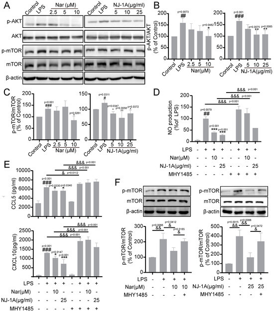 NJ-1A and Nar inhibit the secretion of chemokines and inflammatory factors in activated BV-2 cells through the AKT/mTOR signaling pathway. (A–C) NJ-1A and Nar inhibited the phosphorylation of AKT and mTOR, n = 3. (D,E) The mTOR agonist MHY1485 abolished the inhibitory effects of NJ-1A and Nar on NO, CCL5, and CXCL10, n = 5. (F) The mTOR agonist MHY1485 eliminated the effect of NJ-1A and Nar on the phosphorylation of mTOR, n = 3. Data represent the mean ± SD; vs. Control, # p < 0.05, ## p < 0.01, ### p < 0.001; vs. LPS, * p < 0.05, ** p < 0.01, *** p < 0.001, & p < 0.05, && p < 0.01, &&& p < 0.001.