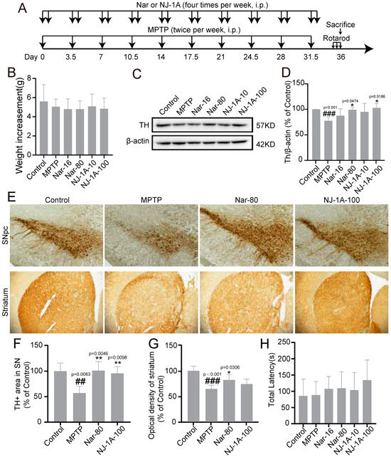 We utilized MPTP-induced chronic Parkinson’s disease mouse models to explore the neuroprotective effects of NJ-1A and Nar (Figure 9A). During the entire experiment, the body weight of the mice in each group increased by 5–6 g, and there was no significant difference in the increased values among the groups (Figure 9B). The results indicated that the expression level of tyrosine hydroxylase (TH, a major marker of dopaminergic neurons in the ventral midbrain) in the brains of MPTP-induced mice was significantly decreased. After treatment with different doses of NJ-1A and Nar, the expression of TH in the mouse brains increased (Figure 9C,D). Moreover, immunohistochemical staining results also revealed a substantial reduction in the number of TH-positive cells in the substantia nigra and striatum of the brains of chronic Parkinson’s disease mice. Following the administration of the drugs NJ-1A and Nar, the number of TH-positive cells increased (Figure 9E–G). However, the MPTP group did not show impairments in rotarod tests compared to the control group, and the drug-administered group did not exhibit any improvement effects (Figure 9H).