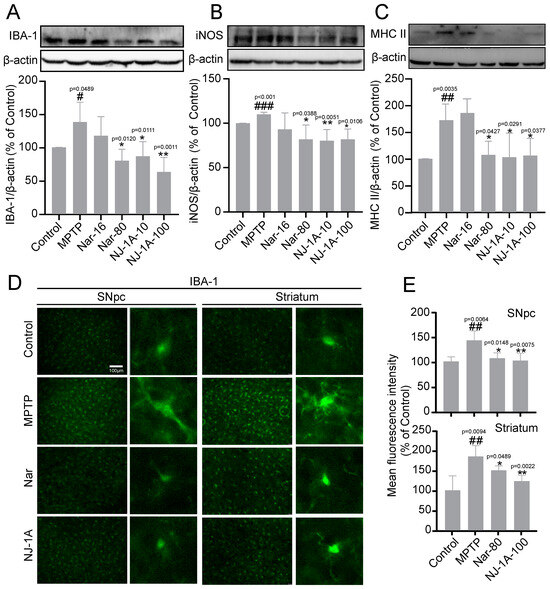 NJ-1A and Nar can inhibit the activation of microglia in the brains of mice in models of Parkinson’s disease induced by MPTP. (A–C) Western blot results showed that NJ-1A and Nar can inhibit the expression of activated microglial markers IBA-1, iNOS, and MHCII in the ventral midbrain, n = 4; (D,E) Immunofluorescence results demonstrated that NJ-1A and Nar can suppress the expression of the activated microglial marker Iba1 in the substantia nigra and striatum, n = 4. Data represent the mean ± SD; vs. Control, # p < 0.05, ## p < 0.01, ### p < 0.001; vs. MPTP, * p < 0.05, ** p < 0.01. Scale bar, 100 μm.