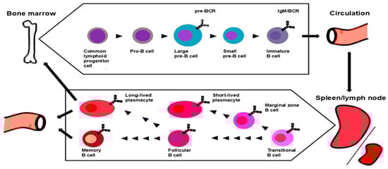 In mammals, B cells mainly originate in hematopoietic stem cells that reside in the bone marrow and differentiate through a multistep process. Hematopoietic stem cells give rise to B cell progenitors via the stages of lymphomyelo-primed progenitors and common lymphoid progenitors. The maturation of lymphomyelo-primed progenitors into common lymphoid progenitors is induced by Fms-like tyrosine kinase 3 signaling, which upregulates lymphoid-specific genes (E2a, Il7ra, and Ebf1) [15,16] (Figure 1).