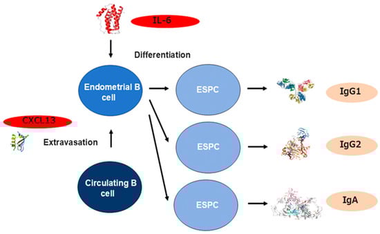 The increase in densities of ESPCs in the endometrium with CE seems attributable to the selective recruitment of circulating B cells into the endometrium. We investigated the endometrial expression profiles of the chemokines that can induce the selective migratory responses of peripheral blood B cells and PCs (CCR2, CCR7, CXCR1, CXCR2, CXCR4, and CXCR5 ligands) in CE. Of these seven potential chemokines, CXCL13, a CXCR5 ligand that displays a selective chemotactic activity for B cells, is abnormally expressed in endometrial endothelial cells in women with CE, along with CXCL1 in endometrial epithelial cells. In addition, selectin E, a ligand to endoglycan, a sialomucin presented on peripheral blood B cells, is aberrantly expressed in human endometrial endothelial cells in CE [100] (Figure 2). These findings suggest that these local inflammatory microenvironments in CE induce selective extravasation of B cells, rather than PCs, from circulation into the endometrial stromal compartment via endometrial microvessels and attract them further into the epithelial area. These pro-inflammatory molecules are found to be locally induced in isolated endometrial microvascular endothelial cells (CXCL13 and selectin E) and endometrial epithelial cells (CXCL1) in vitro by microbial antigens such as lipopolysaccharide, a Toll-like receptor 2/4 ligand [100]. Moreover, the concentration of IL-6, a differentiation factor of mature B cells, is significantly higher in the menstrual blood of women with CE than in those without CE, indicating that the inflamed endometrium with CE provides extravasated B cells with the niches for in situ differentiation into PCs [101]. Regarding the local Ig profiles, the densities of IgM, IgA1, IgA2, IgG1, and IgG are higher in the stromal compartment during the proliferative phase in the endometrium with CE than those without CE. The endometrial Ig subclasses in CE are characterized by the highest density of IgMpositive stromal cells and the predominance of IgG2positive stromal cells over IgG1positive counterparts [88].