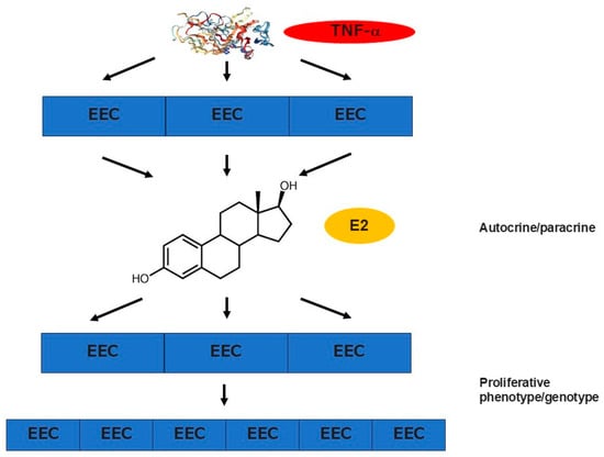 - Gori, I.; Pellegrini, C.; Staedler, D.; Russell, R.; Jan, C.; Canny, G.O. Tumor Necrosis Factor-α Activates Estrogen Signaling Pathways in Endometrial Epithelial Cells via Estrogen Receptor. Mol. Cell. Endocrinol. 2011, 345, 27–37. [Google Scholar] [CrossRef] [PubMed]