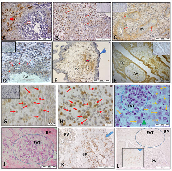 We investigated spatial and temporal HLA-C expression at the MFI of healthy pregnant women with a focus on trophoblast subpopulations (Figure 1B–L). Breast cancer tissue was used as a positive control for the specificity of HLA-C staining, since the tumor cells specifically expressed HLA-C (Figure 1A). Our results demonstrated that HLA-C is differentially expressed in distinct trophoblast cell populations. An intense HLA-C signal was found on the interstitial EVT (iEVT) cells invading the decidua (Figure 1B,G) and on intravascular EVT (ivEVT), remodeling the blood vessels (Figure 1D). Note the numerous EVTs invading the decidua during the first EVT invasion wave (8–10 gw). A relatively weak HLA-C expression was detected in the wall of the blood vessels (Figure 1C), in the mesenchyme core of the chorionic villi (Figure 1E), and on the highly proliferative intermediate cytotrophoblast (iCT) cells in the trophoblast columns of the anchoring villi (Figure 1F). HLA-C was notably absent from syncytiotrophoblast cells of the floating chorionic villi (Figure 1E). Parallel staining for HLA-G confirmed the identity of EVT cells (Figure 1H). iEVT cells were stained for HLA-C and HLA-G on serial sections (brown cells, Figure 1G and Figure 1H, respectively). Although the decidual stromal cells (DSCs) showed weak HLA-C signals, they could be distinguished from the EVT cells by their size and morphology (Figure 1G,I). Interestingly, the stationary EVT cells in the placental bed at the end of pregnancy (Figure 1J) exhibited strong HLA-G signals but weak to negative HLA-C signals (Figure 1K and Figure 1L, respectively).