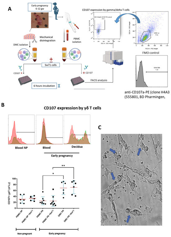 Degranulation of γδT cells from pregnant and non-pregnant women based on the measurement of CD107 expression. (A) Workflow of PBMC and DMC isolation, co-cultures with EVT-like Sw71 cells, degranulation assay setup, and CD107a expression using anti-CD107a-PE antibody clone H4A3 (555801, BD Pharmingen). CD107426+ cells were analyzed within the γδT-cell population, defined by TCRγδ staining of PBMCs or DMCs and gating of the lymphocytes. The FMO control was used to delineate positive cells. (B) Upper row—representative histograms showing CD107-positive γδT cells within PBMC suspensions of non-pregnant women and within matched DMC and PBMC suspensions from pregnant women (1st trimester) without Sw71 EVT-like cells (pink color) and co-cultured with Sw71 cells (green color). Both histograms (−/+ Sw71 cells) are overlaid, and the brown color represents overlapping of pink and green. (B) Bottom row—graphs showing higher spontaneous degranulation of decidual γδT cells compared to that of the matched peripheral counterparts in pregnant women (1st trimester, n = 8). γδT cells in the blood of pregnant (n = 8) and non-pregnant (n = 6) women degranulated to the same extent. The co-incubation of decidual or peripheral γδT cells with EVT-like Sw71 cells did not change the number of CD107+ γδT cells. Similarly, γδT cells derived from the blood of non-pregnant women did not differ in terms of their degranulation when co-cultured with Sw71 cells. Graph display mean ± SD, GraphPad Prism v.5., * p < 0.05, ** p < 0.01. (C) Representative image of DMCs co-cultured with Sw71 cells, showing the contacts (blue arrow) between decidual mononuclear cells and Sw71 cells during 6 h of co-incubation. No visible detrimental effect on the morphology of trophoblast cells was observed. 20× magnification.