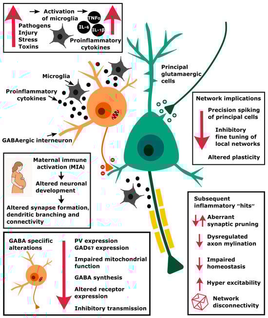 The interplay between inflammation and GABAergic dysfunction is also evident in adults, as individuals with schizophrenia often exhibit elevated levels of peripheral and central inflammatory markers, which correlate with cognitive deficits and reduced GABAergic activity [94,95]. In the adult brain, TNF-α, for example, has been shown to modulate synaptic scaling by increasing the surface expression of excitatory AMPA receptors while simultaneously decreasing inhibitory GABAergic signalling, leading to an imbalance in neuronal excitability [96]. This cytokine-mediated disruption of synaptic homeostasis may contribute to the hyperexcitability and network dysregulation observed in conditions such as schizophrenia. Moreover, chronic exposure to inflammatory cytokines can induce oxidative stress and mitochondrial dysfunction in GABAergic interneurons, further compromising their ability to maintain an inhibitory tone [97].