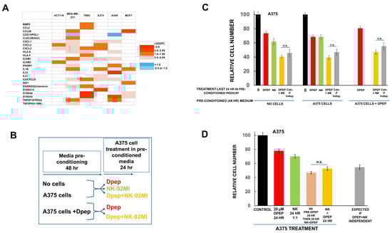 The tumor microenvironment includes multiple secreted proteins that alter NK cell activity [,,]. Examination of Plate-seq data from a past study [] indicates that tumor cells exposed to Dpep for 48 h show cell-context-dependent regulation of a number of genes whose products are reported to affect NK cell function (Figure 3A). In the case of A375 cells, for example, these include upregulated CXCL1, CXCL2, IL1B, and S100A14. To assess whether Dpep-pre-treated cells might enhance NK-92MI cell cytotoxic activity via secreted materials (and thus appear to become sensitized to their actions), we generated media preconditioned by 48 h exposure to no cells, A375 cells, or A375 cells treated with 20 µM Dpep. Fresh A375 cultures were then subjected to 24 h of exposure to these preconditioned media with or without NK-92MI cells, and cell numbers were assessed (Figure 3B,C). The findings were compared with cell numbers anticipated if NK-92MI cells and Dpep acted independently. As anticipated, there was only a small, but statistically unsignificant, level of sensitization for cells in non-conditioned medium (Figure 3C). Similar results were observed with A375-preconditioned medium as well as with medium preconditioned by Dpep-treated A375 cells (Figure 3C). These findings thus indicate that sensitization to killing by NK-92MI cells is not due to substances released from Dpep-treated tumor cells.