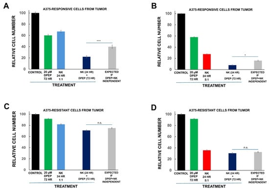Tumor cell sensitization to NK-92MI cells by Dpep requires susceptibility to Dpep killing. (A) Cells isolated from a mouse A375 tumor and that are responsive to Dpep were cultured as indicated and then assessed for cell numbers. Observed results are compared with those expected if the actions of NK-92MI cells and Dpep were independent and indicate sensitization to NK-92MI cell cytotoxicity by Dpep. Data were pooled from two independent experiments, each carried out in triplicate. (B) As in panel (A), except that the E:T ratio was 5:1. (C) As in panel (A) except that the cells were isolated from a mouse A375 tumor that became resistant to Dpep-promoted cell death. (D) As in panel (C) except that the E:T ratio was 5:1. * p < 0.05; *** p < 0.0005.