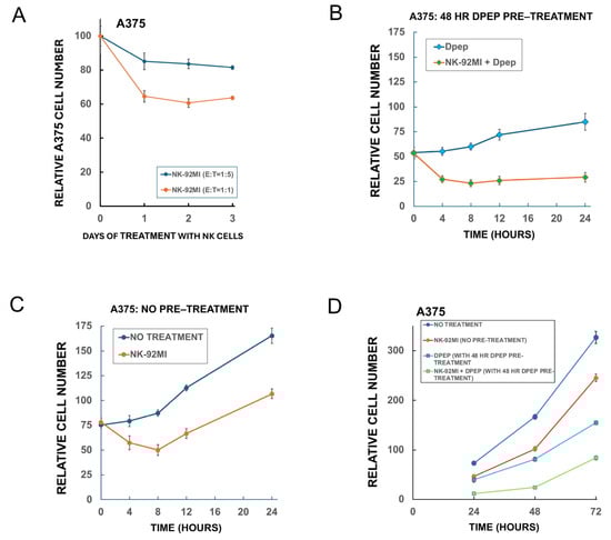 One feature of NK cells is that prolonged exposure to tumor cells can cause them to lose killing efficacy [,,]. Indeed, when A375 cells were exposed to NK-92MI cells for 1, 2, and 3 days at E:T ratios of 1:5 and 1:1, the killing activity largely took place only during the first day (Figure 5A). To more closely examine the time course of NK-92MI cell cytotoxicity on tumor cells under the conditions of our experiments and the effects of Dpep pre-treatment and presence, A375 cells (±48 h of Dpep pre-treatment) were exposed to NK-92MI cells for 4, 8, 12, or 24 h and then assessed for cell numbers (Figure 5B,C). The findings indicate that maximal cytotoxicity with NK-92MI cells occurred by about 4–8 h of exposure, irrespective of Dpep pre-treatment/presence. Without Dpep pre-treatment, after 8 h of NK-92MI cell exposure and the consequent reduction in cell numbers, the A375 cells commenced to increase in number at a rate similar to that in untreated cultures (Figure 5B). For A375 cells pre-treated and maintained with Dpep, the increase in cell number over the course of the experiment (compared with non-treated cells) was substantially attenuated as anticipated due to cell death and suppression of proliferation [] (Figure 5C). For the condition in which Dpep-pre-treated cells were exposed to NK-92MI cells + Dpep, there was very little recovery of cell numbers over 24 h, thus substantiating the enhanced efficacy of the combined treatments.