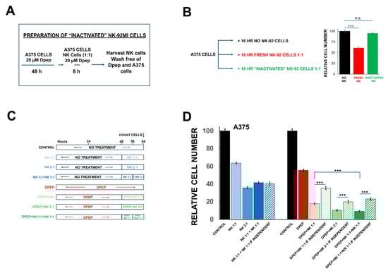 To assess whether the observed loss of cytotoxicity by NK-92MI cells after prolonged culture with tumor cells reflects their “inactivation”, A375 cells were seeded into 96-well plates at 0.1 mL per well and treated with 20 µM Dpep for 48 h. NK-92MI cells were then added as a 0.1 mL suspension at a 1:1 E:T ratio for coculture with A375 cells for an additional 8 h, with the Dpep concentration maintained at 20 µM. Subsequently, NK-92MI cells were collected, washed to remove A375 cells and residual Dpep, and added to freshly seeded A375 cells at a 1:1 E:T ratio. For comparison, the same number of fresh NK-92MI cells were also added to fresh A375 cultures. After 16 h of coculture, cell counting was performed.