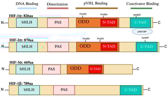 HIFs are transcription factors that belong to the superfamily of basic helix–loop–helix (bHLH) proteins. They are heterodimers made up of an oxygen-regulated HIF-ααα subunit and a constitutively expressed HIF-β subunit also known as AHR nuclear translocator, ARNT [6]. Both the bHLH domain and per-ARNT-Sim (PAS) have been identified to be essential for HIF dimerization. However, the basic domain is involved in DNA binding, while the helix–loop–helix domain is involved in the dimerization between the two subunits. The PAS domain is involved in protein–protein interactions [7]. Both HIF-1α and HIF-2α isoforms contain other functional domains: terminal transactivation domains (TADs) and an oxygen-dependent degradation domain (ODD). However, HIF-3α does not have a C-TAD and acts as a dominant-negative regulator of HIF1/DNA binding [8]. The C-TAD interacts with coactivators like CBP/p300 to modulate the transcription of HIF-α in hypoxia, whereas the N-TAD is responsible for stabilizing HIF-α against degradation. The ODD is a highly conserved domain that overlaps the N-TADs and includes amino acids that are targets for hydroxylation, such as asparagine (N) and proline (P) residues under normal oxygen levels. Therefore, the ODD facilitates oxygen-regulated turnover and regulates the activity and stability of the alpha subunits [9] (Figure 1). The functional domains of the HIF-1α and HIF-2α isoforms share a significant degree of similarity and are subject to hydroxylation of particular proline and asparagine residues which controls both their expression and transcriptional activity [10]. HIF-1α and HIF-2α are identical in terms of amino acid sequence, at 48%, and in terms of their bHLH and PAS domains, they share 83% and 70% similarity, respectively [11].