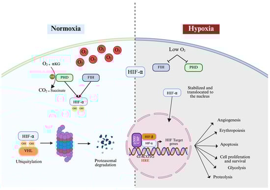 Canonical regulation of HIF-α activity under normal and hypoxic conditions. PHDs hydroxylate HIF-α on proline residues inside the ODD in the presence of oxygen (normoxia). Hydroxylation causes the Von Hippel–Lindau (VHL) E3 ligase complex to engage, ubiquitinating HIF-α and targeting it for proteasomal degradation. Hydroxylation of the asparagine residue through FIH precludes CBP/p300 from binding to HIF-α. PHD and FIH are inhibited and thereby the HIF-α subunit is stabilized due to the lack of hydroxylation. HIF-α is then translocated to the nucleus, where it dimerizes with HIF-β. The dimer binds to HREs and regulates target gene expression. The figure was created with BioRender.com.
