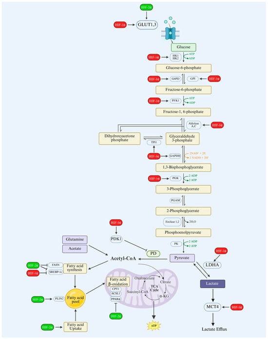Both HIF-1α and HIF-2α contribute to metabolic reprogramming by regulating some common target genes implicated in metabolism, such as glucose transporters [109]. However, they serve distinct roles in regulating energy metabolism under hypoxic conditions. HIF-1α is more dominant in controlling glycolysis, rapidly initiating the adaptive response to acute hypoxia by upregulating genes that enhance glycolysis and suppress oxidative phosphorylation [110]. This involves the direct activation of transcription for essential enzymes in the glycolytic pathway, such as hexokinase, phosphofructokinase, aldolase, pyruvate kinase M2 (PKM2), and lactate dehydrogenase (LDH), facilitating the conversion of glucose to lactate [2,80]. The lactate produced during glycolysis is a substrate for the biosynthesis of macromolecules, including lipids, proteins, and nucleic acids, vital for proliferation and survival. Additionally, HIF-1α enhances glucose uptake by increasing the expression of glucose transporters, notably GLUT1 and GLUT3, ensuring an abundant supply of substrate for glycolysis [111,112].