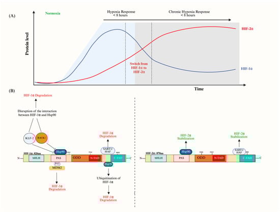 The transition from HIF-1α to HIF-2α stabilization. (A) The HIF switch’s temporal dynamics in response to protracted hypoxia. The HIF-1α level rapidly builds up within the first few hours. A reduction in the HIF-1α level starts at the 8 h mark as HIF-2α levels start to rise and last for more than 24 h. (B) Multiple players acting on HIF-1α causing its subsequent degradation, including KLF2, RACK1, MDM2, and HAF. HSP90 and HAF work on the stabilization of HIF-2α. The figure was created with BioRender.com.