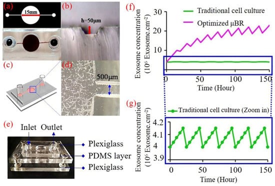 During all trials for increasing the number of exosomes, the parallel culture in µBRs was monitored for cell viability and cytotoxicity effects of partially remained exhausted medium in the µBR chamber, which always kept the cells fresh (always more than 95% viable cells) (Figure 3g,h).