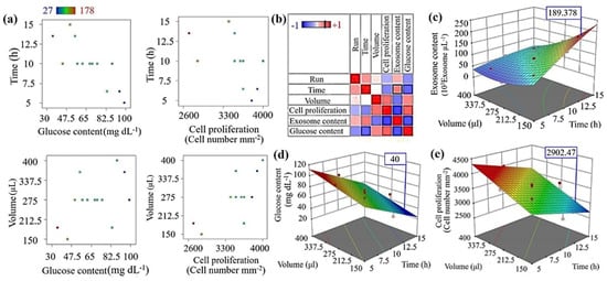 Response Surface Methodology (RSM) for mathematical modeling and optimization of Glioblastoma cell culture in the micro-bioreactor. Two variables, volume of exchange medium and interval time of medium renewal, which govern the feed rate (volume/time) have been hired as variables in RSM to optimize three responses, exosome content, glucose content, and cell proliferation. (a) The correlation between variables changes and responses in study points. (b) Exosome content sensitivity analysis correlated to the other variables and responses. (c–e) Exosome content, Glucose content, and cell proliferation models in the microbioreactor cell culture. The ratio between maximum and minimum cell number is 1.48 which shows a limited effect of culture condition on cell growth rate. The ratio of max to min for exosome content is 6.6 which is significantly higher than the cell proliferation ratio. The ratio of maximum to minimum for Glucose content is 2.8 which shows the constraint effect of the parameter in culture condition. Therefore, glucose concentration below 40 mg/dL is not allowed in the incubation period.