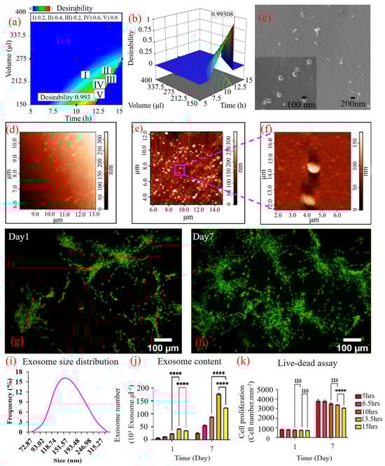 Exosome content was selected as the TME enrichment criterion. Isolated exosomes were characterized using electron microscopy (Figure 3c) and atomic force microscopy (Figure 3d–f). Most of the isolated nanoparticles extracted from discharged µBR medium ranged between 100 nm and 300 nm, as confirmed by dynamic light scattering measurement (Figure 3i). The growth rate of the exosomes, in terms of number in a controlled volume, was measured on day one and day seven of cancer cell cultivation in the µBR with different medium renewal intervals (Figure 3j). The results clearly indicate a significant increase in exosome content by lowering the number of medium exchanges. By increasing the interval time of medium exchanges from 5 h to 6.5, 10, 13.5, and 15 h, as suggested via RSM, an almost linear increase was observed in exosome number, starting from 50 × 103 exosomes/µL (at 5-h intervals) to about 178 × 103 exosomes/µL at 13.5-h intervals (Figure 3j). The accumulation of exosomes in the µBR chamber during the culture was also confirmed by comparing the exosome numbers between day 1 and day 7 (Figure 3j), which confirms the effectiveness of the feeding strategy and the model.