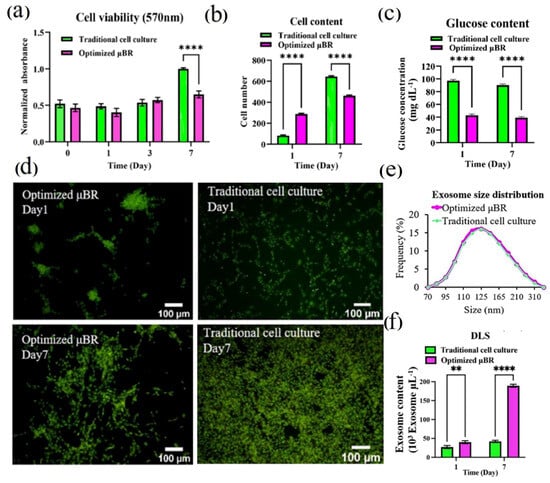 Glioblastoma cell culture under optimized condition in μBR vs. traditional cell culture. (a) Viability results of U87MG cell cultured in two groups (traditional cell culture and optimized µBR) for 7 days using MTT assay, (p-value < 0.01) shows the cells are prolife in the optimized condition in µBR. (b) The Quantified graph of Cell count in traditional cell culture and µBR on days 1 and 7. (c) The graph of Glucose content in traditional cell culture and optimized µBR on days 1 and 7. (d) Fluorescent microscopic image of live/dead assay on U87MG cells in traditional culture and optimized µBR by AO staining on days 1 and 7. (e) Size distribution analysis of exosome collected from Traditional cell culture and optimized µBR using dynamic light scattering (DLS). (f) Exosome content of optimized culture medium in µBR vs. Traditional cell culture on days 1 and 7, shows more than 4-fold accumulation of exosome in optimized µBR using optimized fed-batch strategy. ** p-values < 0.01, and **** p-values < 0.0001.