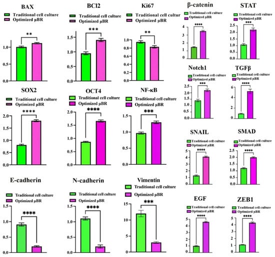 The RT-qPCR analysis. The mRNA expression levels of the BAX (as an apoptotic marker), Bcl2 (as an anti-apoptotic marker), Ki67 (as a proliferation marker), OCT-4 and SOX2 (as stemness gene), NF-κB (as an inflammation factor and coactivator of CSC and EMT related genes), E-cadherin, N-cadherin, Vimentin, SNAIL and ZEB1 (as EMT marker), β-catenin, STAT3, Notch1, TGFβ, EGF and SMAD (as crucial regulator genes in stemness and EMT related genes) and β-actin (as an internal gene), were detected by Real-time PCR in µBR and traditional cell culture on days 0 and 7. ** p-values < 0.01, *** p-values < 0.001 and **** p-values < 0.0001.