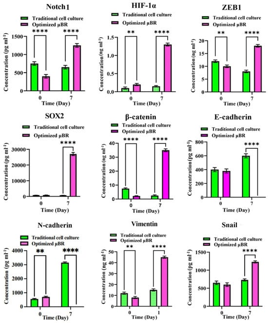 The cultured medium of U87MG cells was collected. The cultured medium of U87MG cells was collected. The expression levels of the following key proteins, Notch1 (main player of important pathway in triggering EMT), HIF1 (Hypoxia-Inducible Factor 1 is known for its involvement in promoting aggressiveness in cancer cells, regulates cellular response to hypoxia and can enhance invasion potential by inducing various target genes related to angiogenesis, epithelial-mesenchymal transition (EMT), and extracellular matrix remodeling), ZEB1 (as EMT marker, related to dedifferentiation of the glioblastoma cells to mesenchyme which convert cells to a motile type and its expression is associated with higher grades of malignancy, tumor progression and invasion), SOX2 (as stemness marker has been linked to enhanced invasiveness in various cancer types, potentially through EMT induction and interaction with other signaling pathways), β-catenin (a component of the cell-cell adhesion complex and of the canonical Wnt pathway, regulates proliferation, adhesion, and migration in different cell types, as crucial regulator in stemness and EMT related genes), E-cadherin (an epithelial marker), N-cadherin (cancer epithelial marker), Vimentin (mesenchymal marker), SNAIL (as EMT marker constitutes a master switch that directly represses the epithelial phenotype) in Glioblastoma cell line (U87) culture under optimized condition in µBR vs. Traditional cell culture supernatant were measured using ELISA kits on days 0 and 7, following the manufacturers’ protocols: Notch1 and β-Catenin (Thermo Fisher Scientific), HIF1 (Abnova), ZEB1 (Aviva Systems Biology), SOX2, E-Cadherin, N-Cadherin, Vimentin (all from Abcam), and SNAIL (Abbexa).