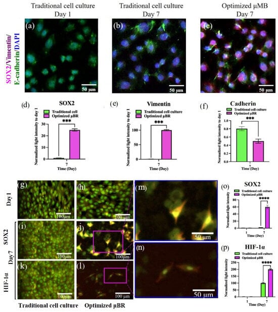 The samples from all study groups were fixed on the µBR surface in 4% paraformaldehyde for a few minutes at room temperature, then the PDMS chamber of the µBR was removed. All samples were washed with PBS three times for 1 min and incubated with the primary antibodies SOX2, Vimentin, E-Cadherin (all from Abcam), and HIF-1α (from Abnova) for 1–2 h at room temperature or overnight at 4 °C. Samples were then washed with wash buffer and PBS three times for 5 min, followed by blocking in 0.5–1% BSA for 30 min at room temperature. After preparation of appropriate dilutions of fluorochrome-conjugated secondary antibodies in 1% BSA, the samples were incubated with the secondary antibody dilution for 2 h at room temperature in the dark, then gently washed in PBS three times for 5 min each. Finally, immunofluorescence images were captured using a fluorescent microscope (Eclipse Ti2-E, Nikon) on days 1 and 7.