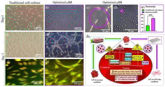 Mathematical modeling of Glioblastoma cell line culture in µBR and alteration of cell fate. (a–j) Behavior of Glioblastoma cell line (U87) in optimized µBR vs. Traditional cell culture. (a,b,f,g) Round and tortuous cells (U87) culture under optimized condition in µBR vs. Traditional cell culture on days 1 and 7. (c–e,h) Closer view of the round and tortuous cells in the optimized µBR on days 1 and 7. (i,j) Fluorescent microscopic image of the U87-MG cell line morphology in Traditional cell culture and optimized µBR by AO staining on day 7. (e) Quantitative analysis of the cell morphology changes (After identifying the outline of the cell, a peripheral circle was created to calculate the tortuosity index using Image J software). (h) Simplified scheme of possible critical proteins involved in signaling pathways in GSCs maintenance in µBR compared to traditional cell culture. All shades of green represent the U87 cell line under normal conditions in traditional cell culture, while all shades of purple indicate the U87 cell line in the optimized µBR inducing an EMT-like condition. *** p-values < 0.001.