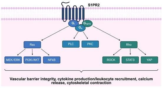 Schematic representation of S1PR2 signaling pathway. S1RP2 couples to multiple G-proteins, including Gαi, Gα12/13, and Gαq, initiating diverse downstream signaling cascades. Abbreviations: S1PR2: Sphingosine-1-phosphate receptor 2; PLC: Phospholipase C; PKC: Protein Kinase C; MEK/ERK: Mitogen-activated protein kinase/Extracellular signal-regulated kinase; PI3K: Phosphoinositide 3-Kinase; AKT: Protein Kinase B; NFκB: Nuclear factor-kappa B; ROCK: Rho associated protein kinase; STAT3: Signal transducer and activator of transcription 3; YAP: Yes-associated protein.