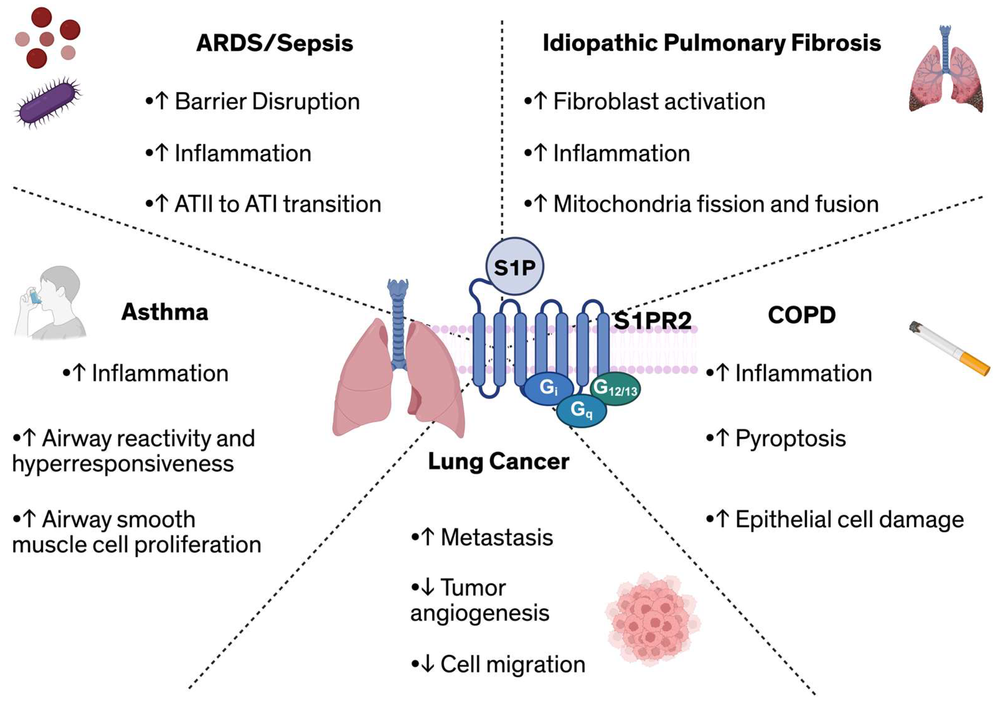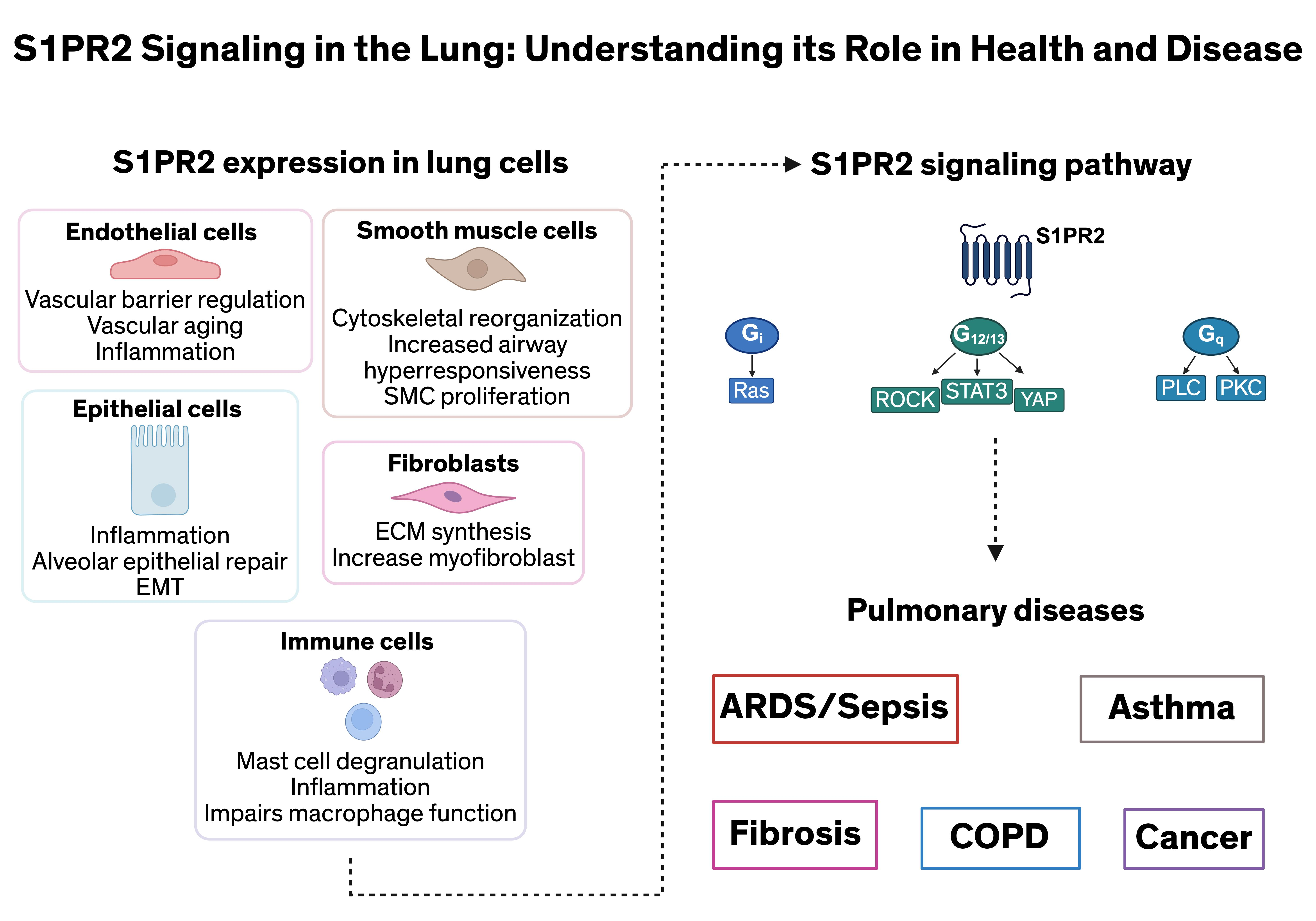 - S1PR2 plays mechanistically important roles across multiple lung diseases, influencing processes such as vascular permeability, inflammation, airway reactivity, and fibrotic remodeling.